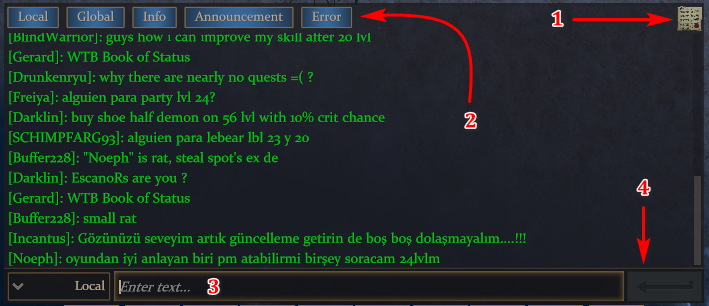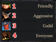 ![]() | 1. If you press the button, the attackmode menu will be opened. 2. Here you can place your skills, potions etc… 3. If you press the button, the chat will be opened. |